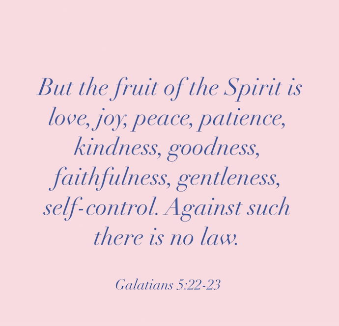 Contrary to the “works” of the flesh which are spoken of in the verses prior to these (see Galatians 5:19-21), the fruit of the Spirit are virtues produced by the Holy Spirit. We produce good fruit through the power of the Holy Spirit and abiding in Jesus, but we can’t produce it on our own.